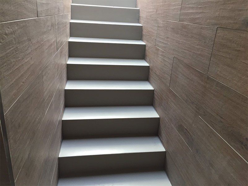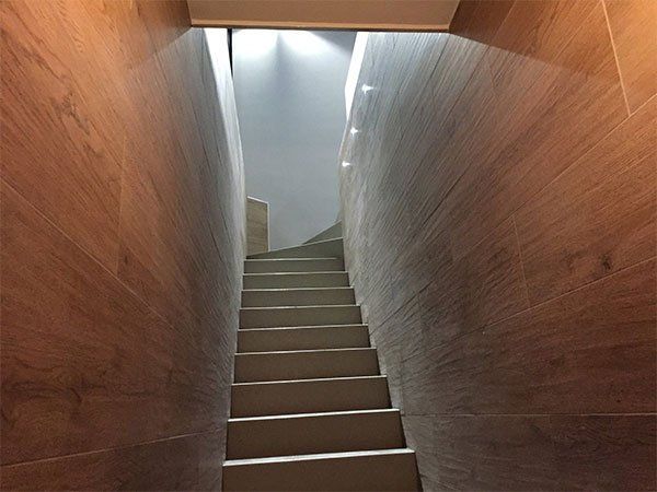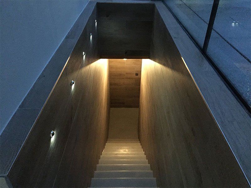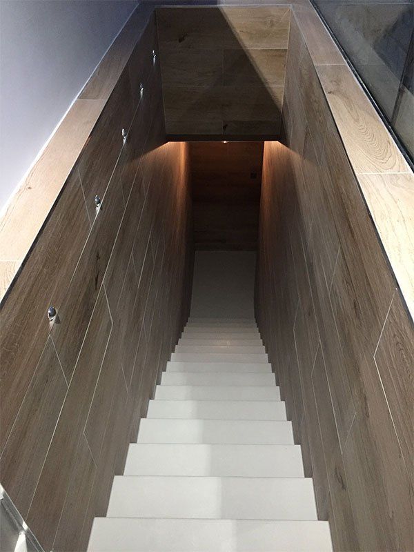 Completed renovation by RELM Interiors on Wimbledon home kitchen and basement. This old, unused basement was transformed into a luxury, modern space, fitting the aesthetic and design of the rest of the home. Spotlight style lights were inserted into the walls as you walked down to the basement and during the day the sunlight streamed onto the stairs creating a modern architectural feel.