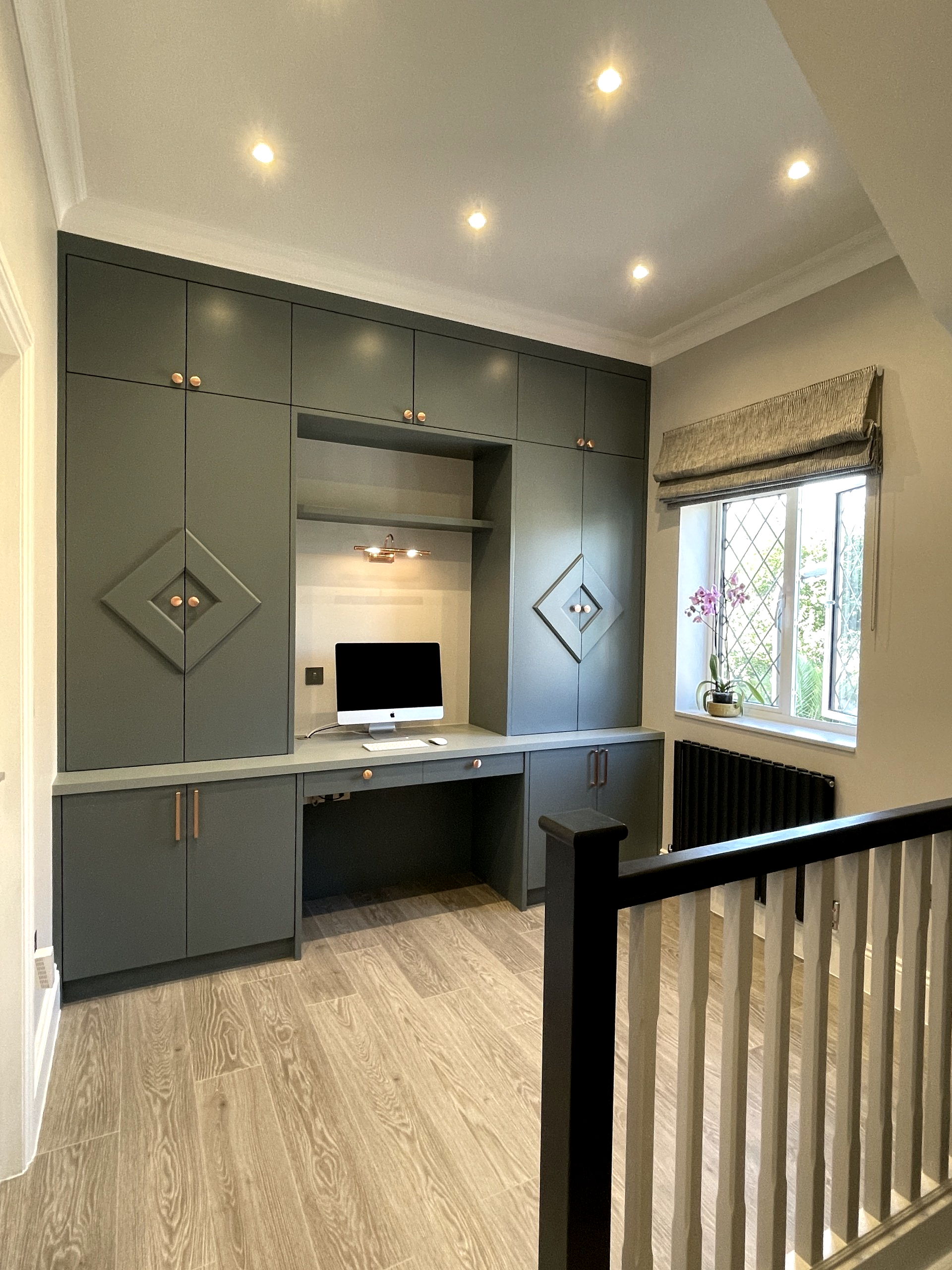 Desk and cabinet for office area built bespoke and fitted on first floor landing of South West London Town house. The office area includes space for a desktop, desk draws, desk, shelves, and cupboards for storage. The woodwork is finished with hand painted diamond style panelling.