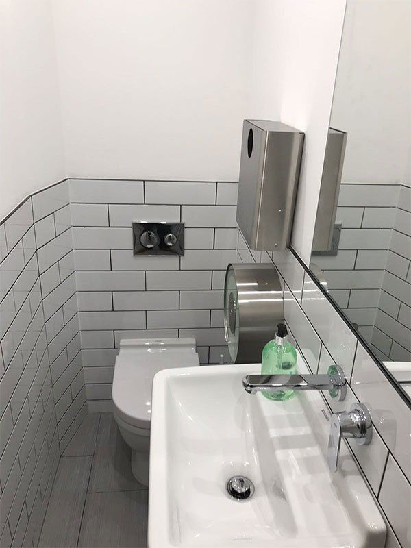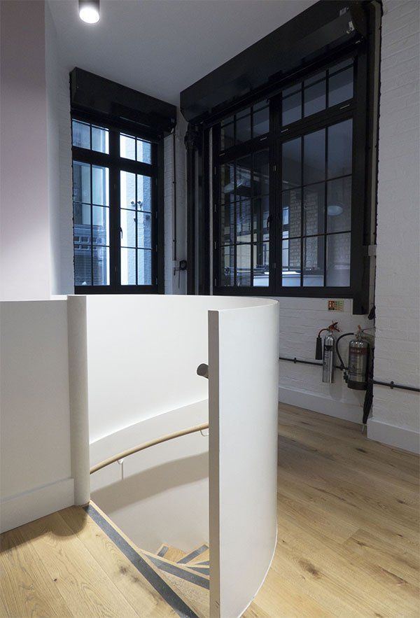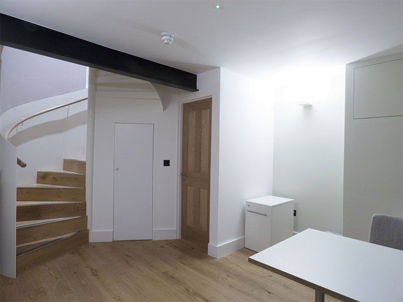 RELM Interiors completed a full renovation on this interesting, contemporary office space. The photos at the beginning of the album show a wall being built in order to provide a small space for a new office toilet. A bespoke, neat and useful kitchenette was also made to measure by RELM. The measurements had to be adjusted in order to allow for cupboards and a dishwasher - which opened to the left of the kitchen as opposed to directly away from the surfaces - whilst still having the necessary space for workers to use. The result is a trendy, modern kitchen with interesting features such as a circular staircase and fashionable yet traditional tiling on the kitchenette.