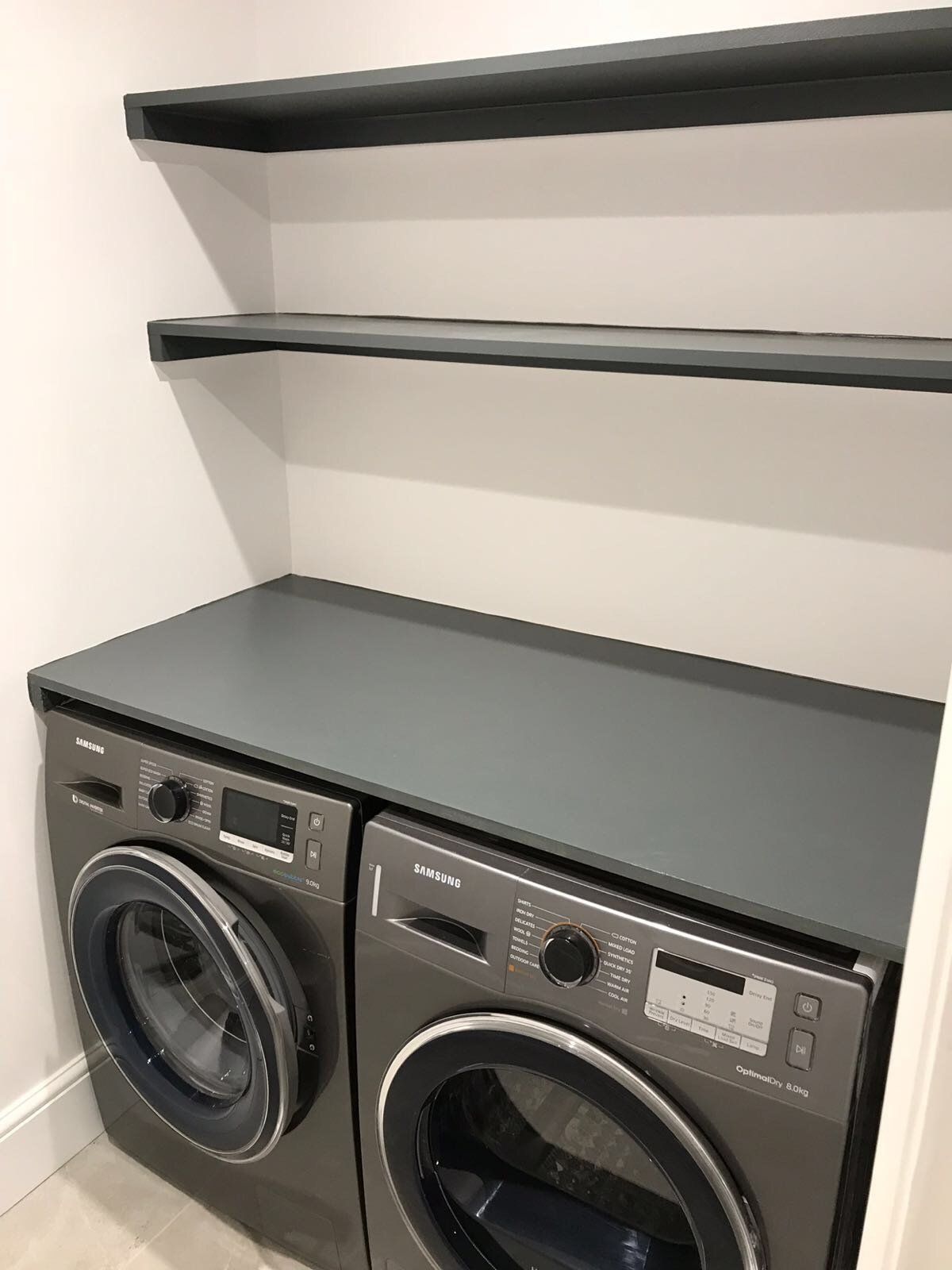 Complete renovation of kitchen come dining area in Pimlico. The renovation of this kitchen consisted of adding spotlights in the ceiling, refitting all new kitchen appliance and painting and decorating. The white wall, bright spotlights and white kitchen surfaces contributed to a bright, well lit space, with the dark grey cupboards and furniture adding a more minimal style to the kitchen - overall creating a calm and relaxing space perfect for families to cook and dine in.